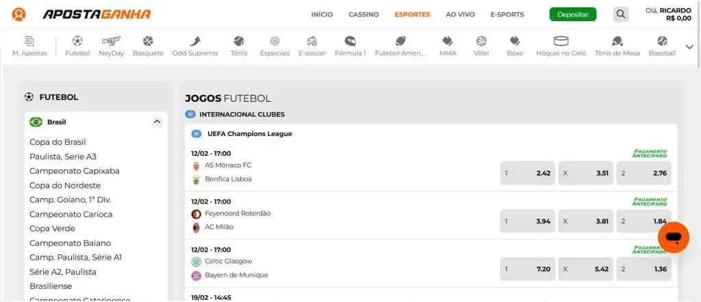 A variedade de mercados e eventos para apostas esportivas é excelente na Aposta Ganha.