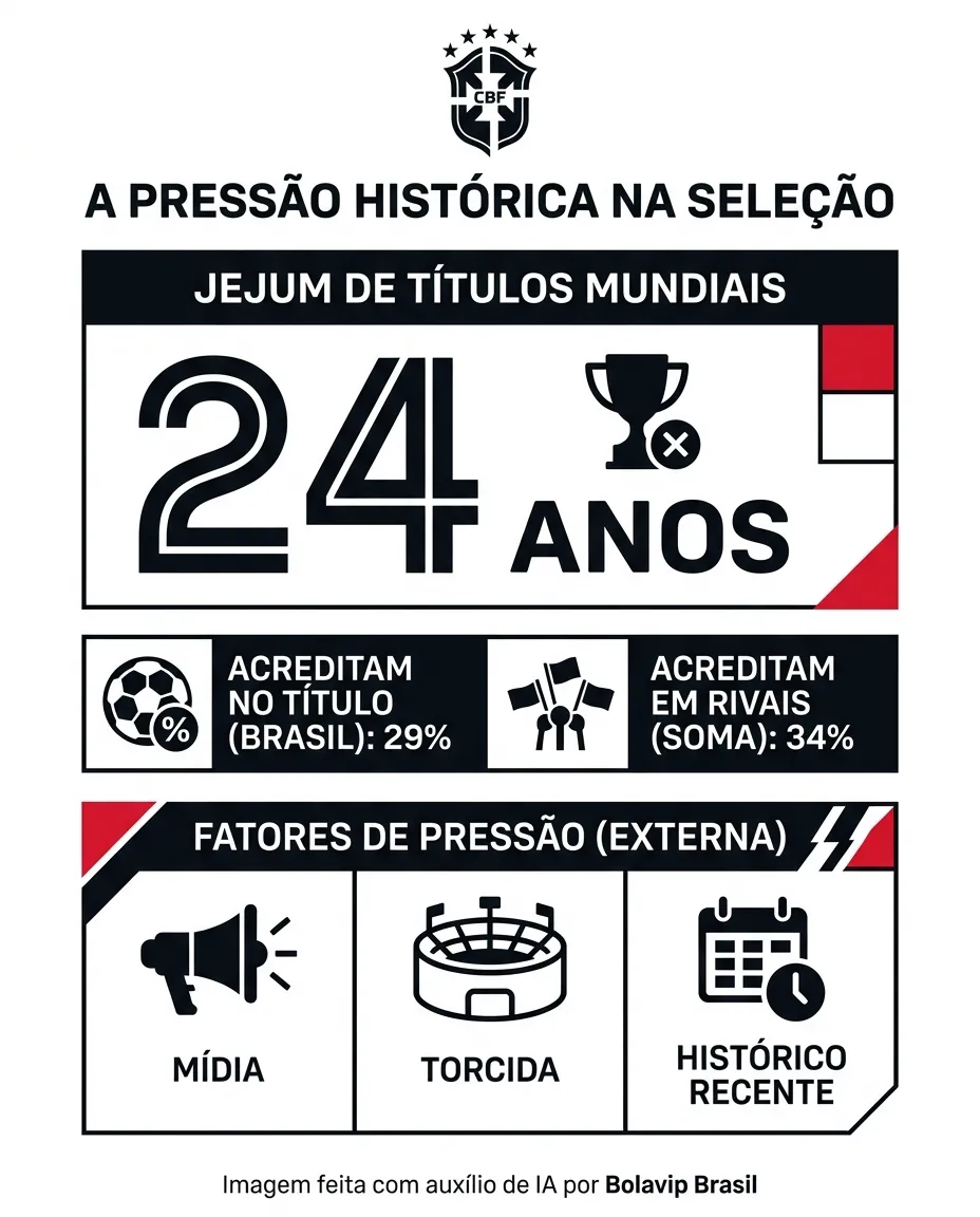 Esse cenário se agrava pelo peso invisível acumulado nos últimos anos. O Brasil não conquista um título mundial há 24 anos e soma eliminações recentes e atuações consideradas abaixo do esperado. O histórico recente amplia a cobrança e reduz a margem para erros.