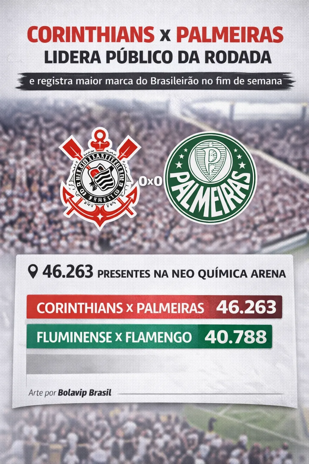 Além de liderar a rodada, o clássico em Itaquera também bateu o recorde de público do estádio em 2026. Segundo o ‘Meu Timão’, a marca superou os 44.769 presentes no confronto contra o São Paulo no início da temporada.