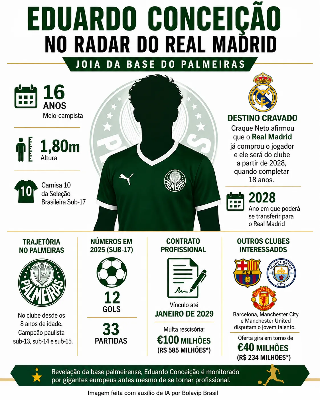 No Verdão desde os oito anos de idade, Eduardo Conceição brilhou na edição mais recente da Copa São Paulo de Futebol Júnior. O meio-campista tem como um dos agentes Douglas Santos, pai de Endrick. A proximidade fez a revelação palmeirense conhecer o Real Madrid, além de outros clubes do Velho Continente.