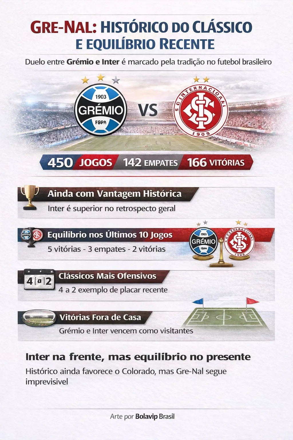 O clássico Gre-Nal, entre Grêmio e Internacional, segue como um dos maiores e mais tradicionais confrontos do futebol brasileiro. Mesmo com vantagem histórica colorada, os duelos recentes mostram um cenário cada vez mais equilibrado e imprevisível.