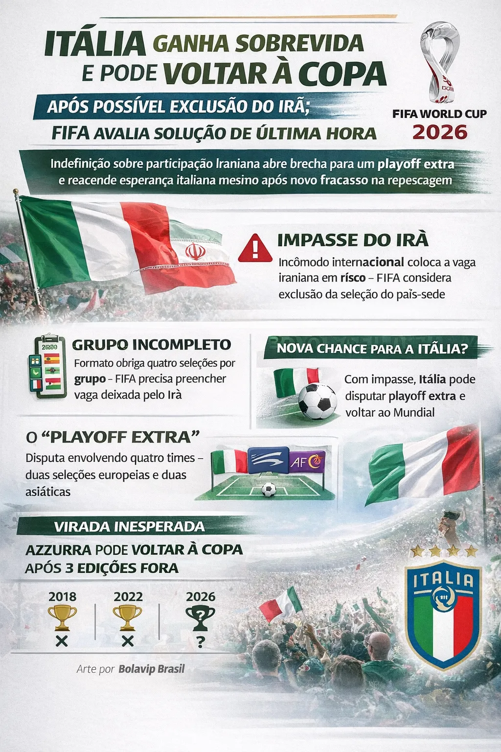 Indefinição sobre participação iraniana abre brecha para um playoff extra e reacende esperança italiana mesmo após novo fracasso na repescagem Fora da Cop...