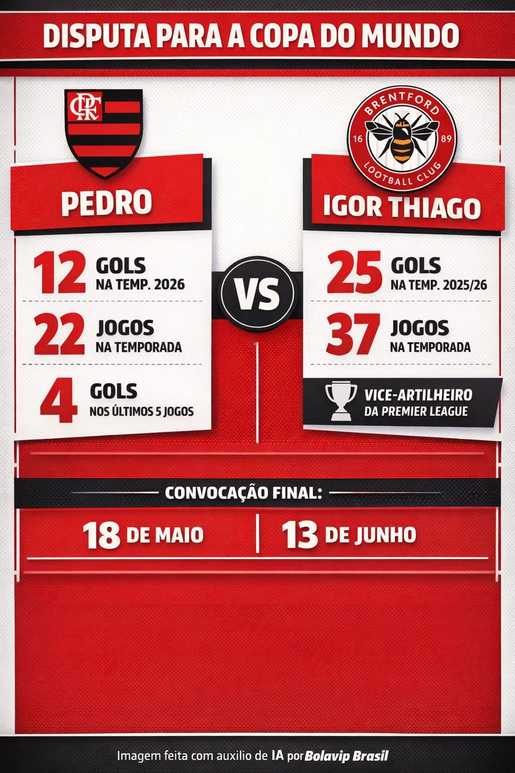 Para o colunista, o principal concorrente direto de Pedro por uma vaga na seleta lista da seleção brasileira é Igor Thiago. O atacante do Brentford fez a sua estreia pelo escrete canarinho na última Data Fifa, marcando de pênalti um dos gols na vitória por 3 a 1 sobre a Croácia, em 31 de março.