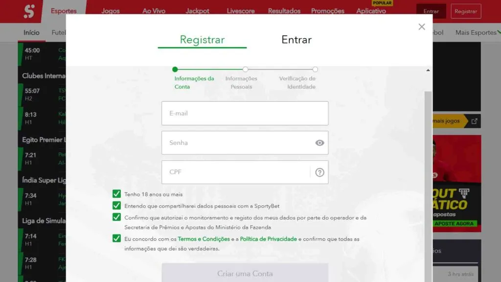Acesse o site sporty.bet.br;Selecione a opção Registrar;Preencha os campos com seu e-mail, senha (crie uma) e CPF;Marque as caixas de concordância em relação aos Termos & Condições;Complete os campos com suas informações pessoais;Faça a verificação obrigatória.