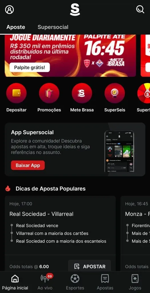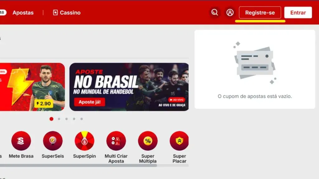 Mete Brasa: responda perguntas diariamente e concorra a R$250.000Mire em altos ganhos: jogue R$100 ou mais em apostas múltiplas e receba R$30 em apostas grátisSuperplacar: Aposte no resultado final e receba o pagamento de forma antecipada se o time abrir 2 gols de vantagemComo fazer o cadastro na Superbet?