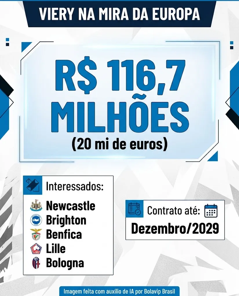 Entre os clubes que acompanham Viery estão Benfica, de Portugal, e os ingleses Brighton e Newcastle, que chegou a enviar olheiros para observar o defensor na Arena, no Gre-Nal de ida da final do Gauchão. Lille, da França, e Bologna, da Itália, também sondaram, mas de maneira informal. A informação é do Globo Esporte.